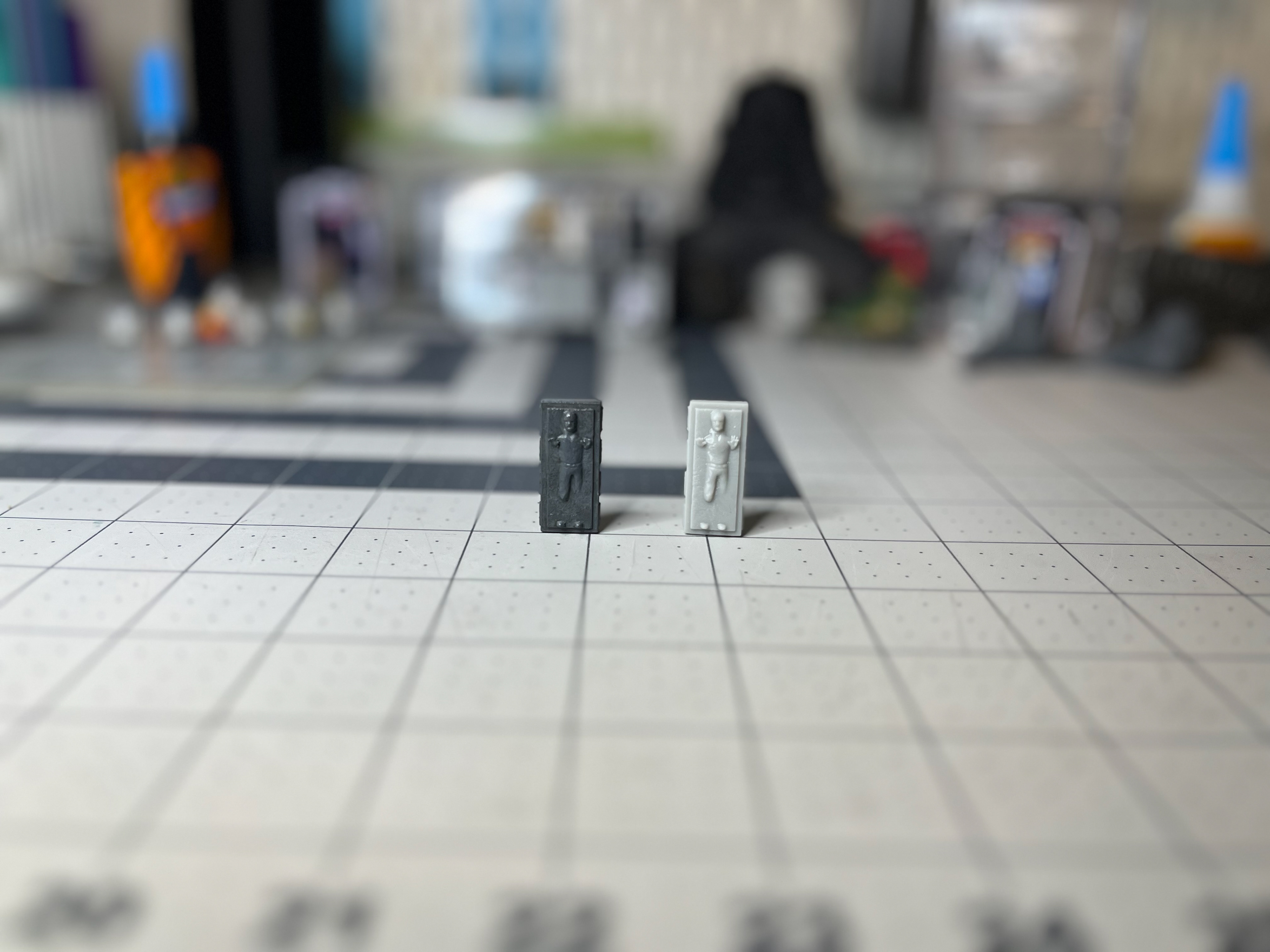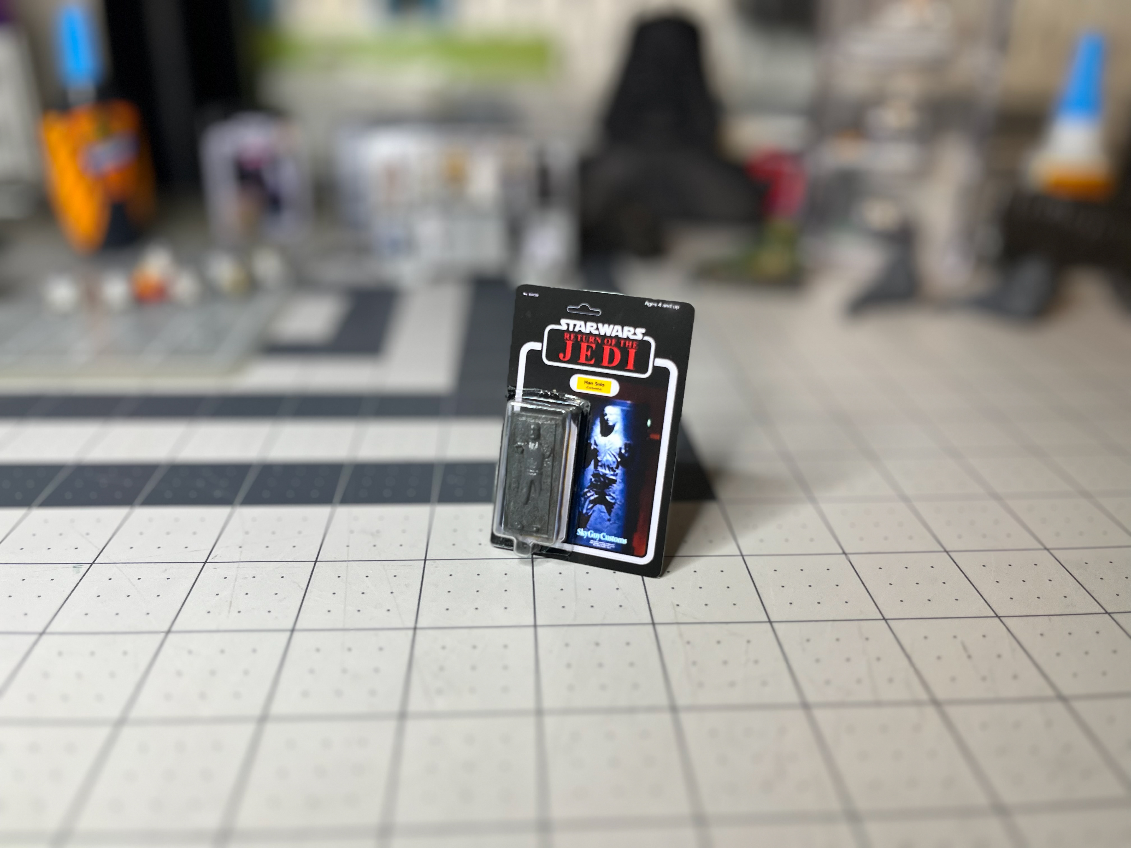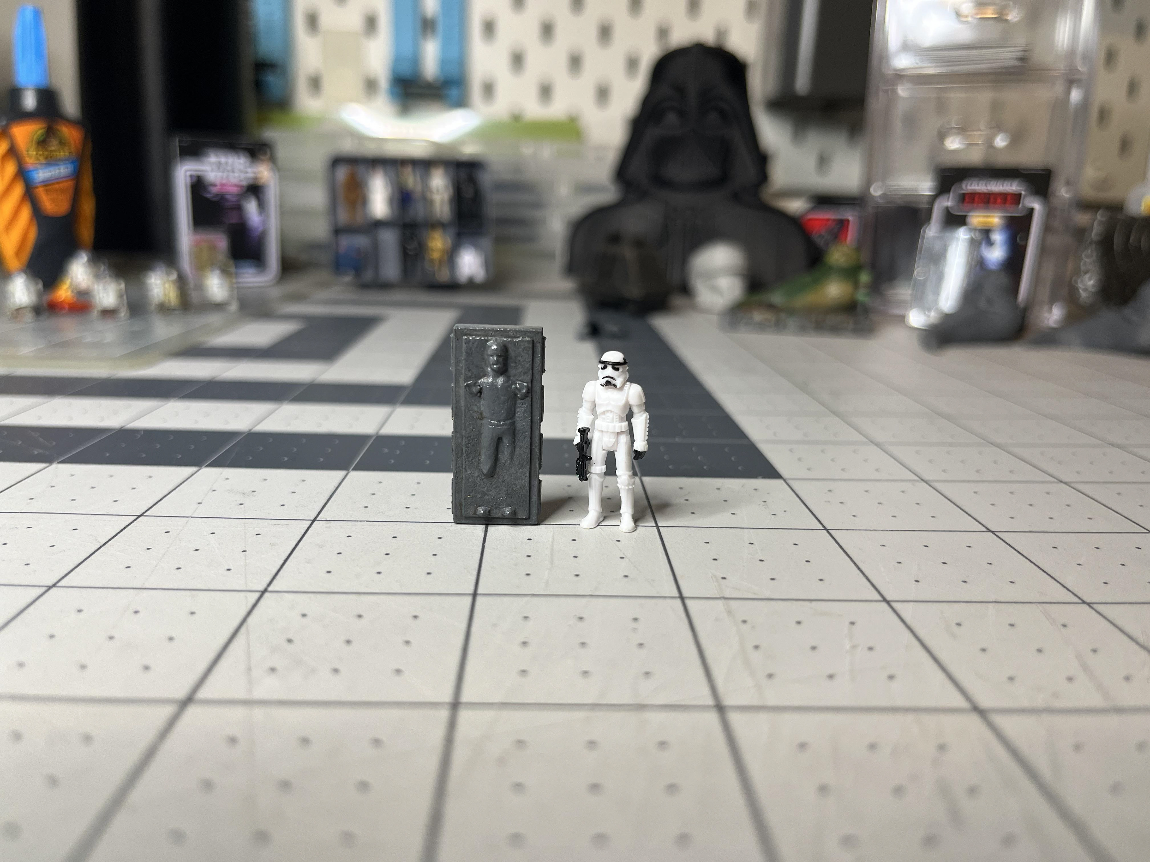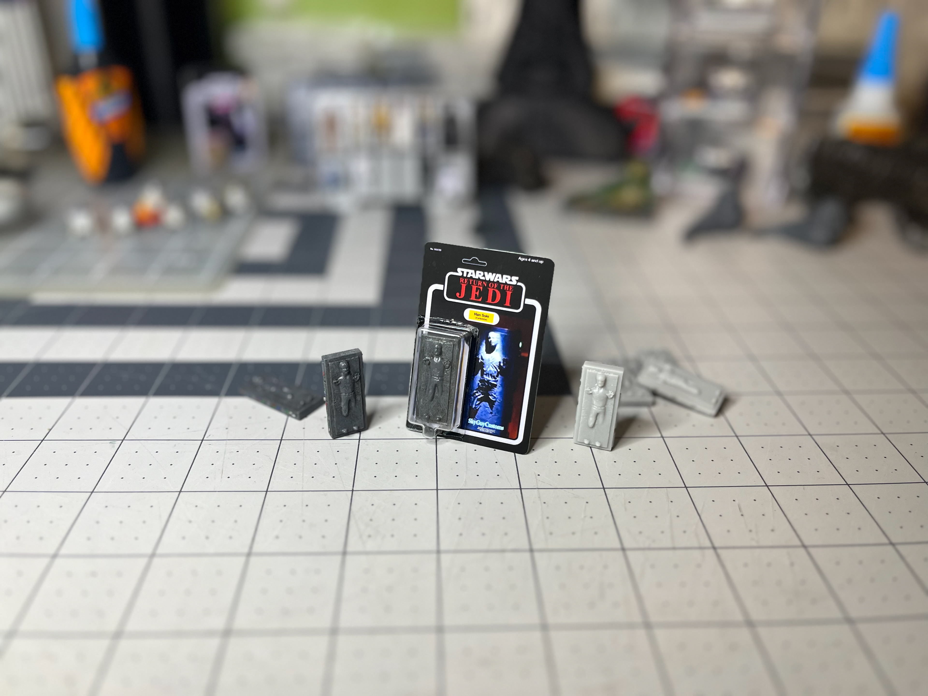Han in Carbonite figures designed to fit the scale of the Jazwares micro galaxy squadron figures. Figures designed in Shapr3d and Nomad Sculpt. Cardback graphics designed in Adobe Illustrator. Figures printed in resin and painted by hand.